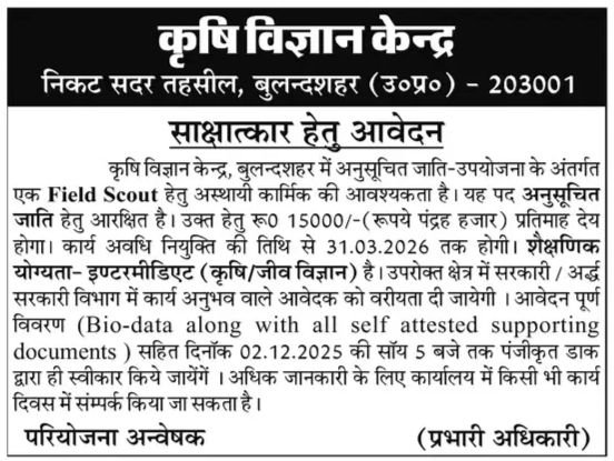 Krishi Vigyan Kendra Recruitment 2025 Notification And Application Form: The Krishi Vigyan Kendra, Bulandshahr has released the latest notification for the recruitment of Field Scout posts on contractual base Offline Form For All India Candidates. Eligible Indian male and Female candidates can apply offline for Krishi Vigyan Kendra Vacancy 2025 from 24 November 2025. All the details related to Krishi Vigyan Kendra Bharti 2025 are given below.